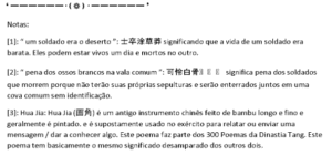 Qi Yunruo estava completamente perdido. Ele olhou ao longe, onde gritos de batalha sacudiam os céus. Olhou para as vidas que, num piscar de olhos, desapareceram. Isso era “um soldado era o deserto[1]” e também “ pena dos ossos brancos na vala comum[2] ”. Além disso, “À beira do luar estava o som trágico e comovente de Hua Jia[3] como camadas de gelo condensadas no uniforme do soldado.” As palavras dos livros transformadas em realidade diante de seus olhos… O príncipe? Onde estava o príncipe? Qi Yunruo se levantou. Percebeu que o campo de batalha já havia mudado. Dentro da Matriz de escamas de peixe, os soldados que ainda mantinham a formação atacaram de maneira oblíqua, matando vários soldados Qiang. Os muitos dias de treinamento de Li Chen não foram em vão. Depois de três fileiras, os soldados Han se protegeram contra duas rodadas de ataques do exército Qiang e mataram alguns milhares deles. Qi Yunruo finalmente descobriu a localização de Li Chen. Não havia muitos soldados Qiang onde ele estava. Qi Yunruo tropeçou enquanto corria para ele.